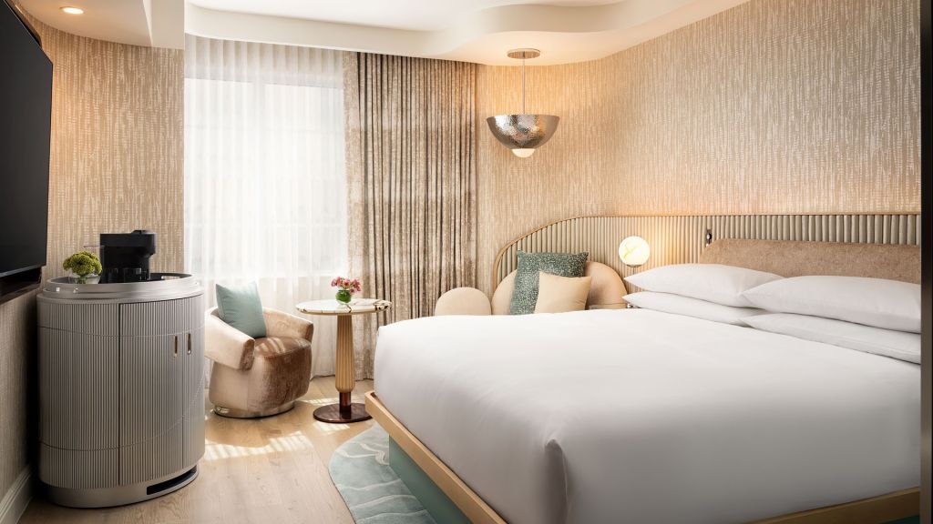 Sink into the comfort of this accessible 350-square-foot space with a king bed, luxurious necessities and the chic, natural style of an ocean retreat. Luxury linens, soft robes and abundant natural light complete your experience.