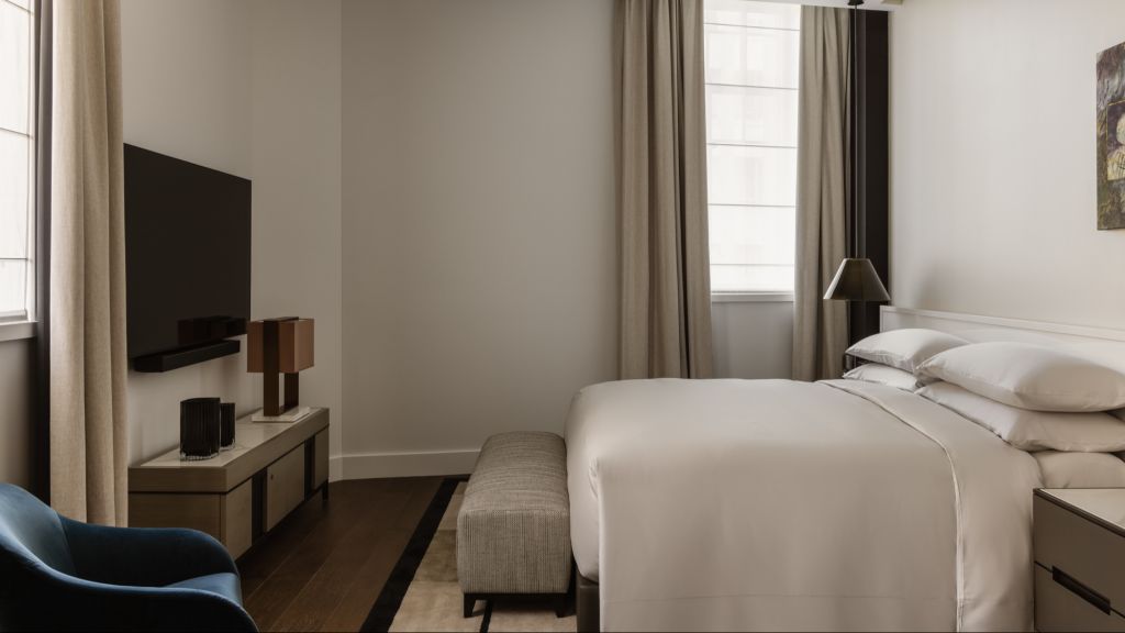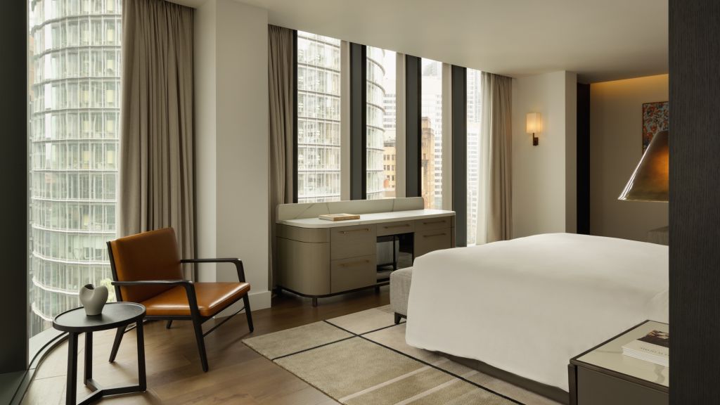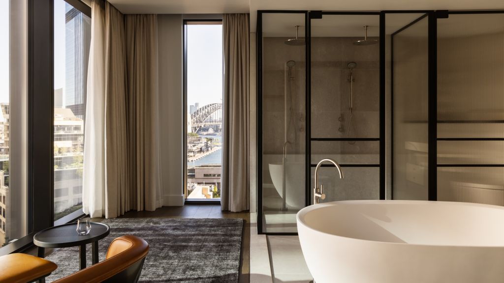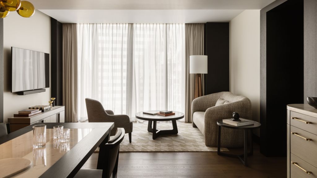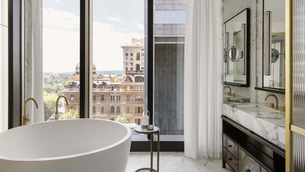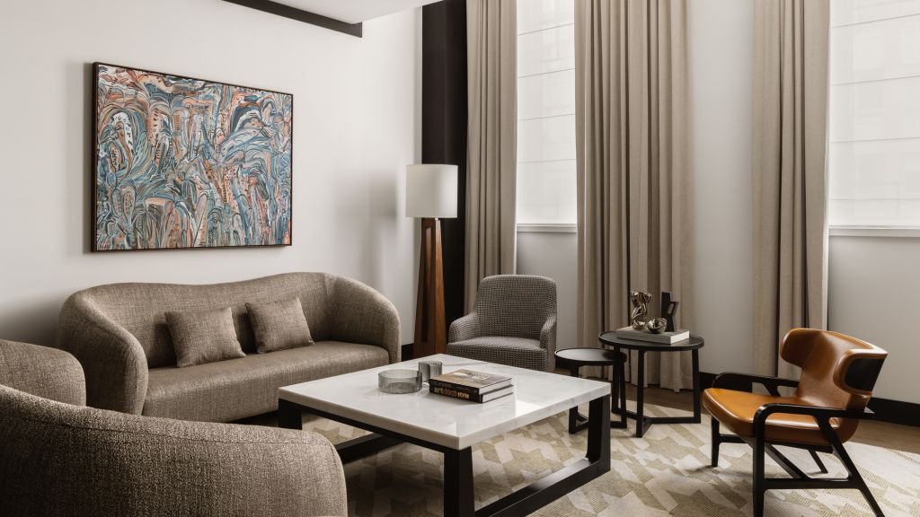 Wrapped in exquisite heritage-listed walls, the spacious 118m², macquarie suite is a true reflection of the building's rich history. blending historic architectural details with sleek modern design, the impressive space not only features lavishly-appointed bedroom and living areas, it also boasts a generous dining room for up to 6 guests. The opulent bathroom offers guests a sanctuary to unwind, with dual vanity, deep-soaking sculptural bathtub as well as walk-in wardrobe and separate powder room.