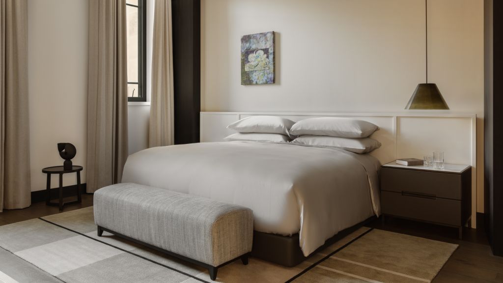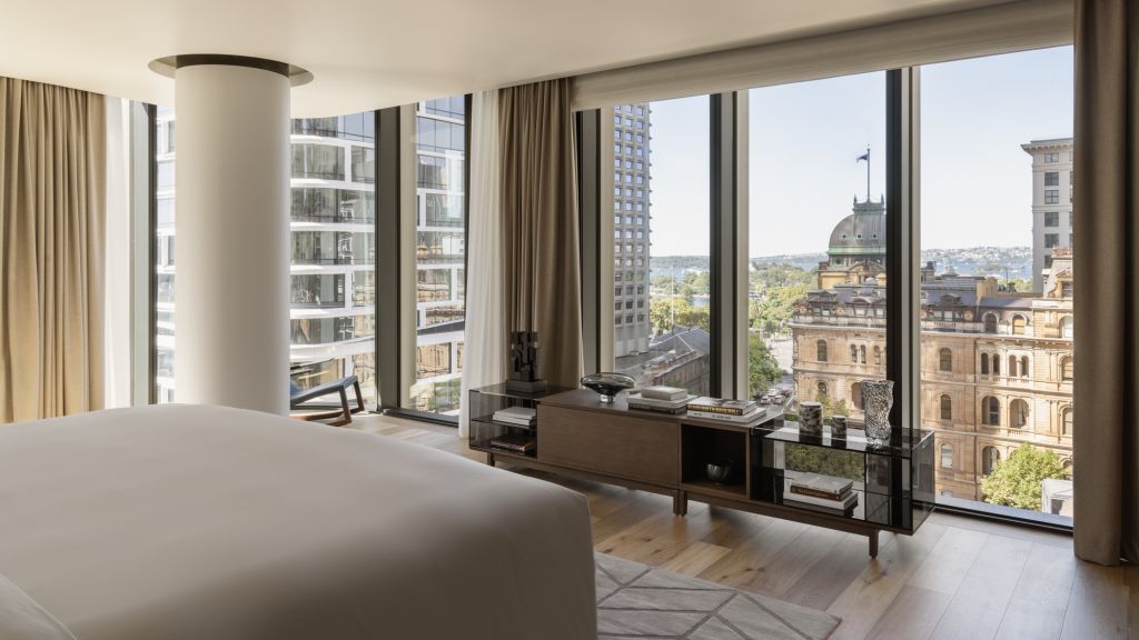 Inside, the sense of history lingers in soaring ceilings, heritage windows and stone detailing, but the mood is resolutely contemporary. Interiors frame the Australian panorama with natural tones, curated artworks and thoughtful textures that shift with the light. The hotel’s 192 rooms and suites feel more like private residences than traditional accommodations, each generous in scale and designed with a quiet sophistication.