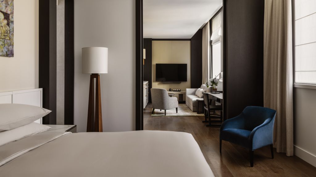 Relish in an exquisite blend of timeless luxury and modern comfort when you immerse yourself in the enchanting features of our skyline suite. soak in the sights of the spectacular cityscape through capacious full-length windows as you unwind in an opulently appointed space. Bathed in natural light, the skyline suite averages a spacious 78m² and is a seamless blend of heritage and contemporary. Guests are treated to generous living and bedroom spaces adorned with lavish furnishings and artworks as well as a luxurious oversized bathroom with dual vanities, rain showerheads and deep-soaking bath.