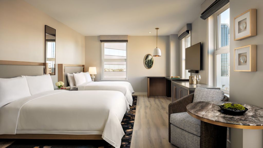 289sf 26sm Hearing Accessible Room with city view. Bathroom with dual vanities.