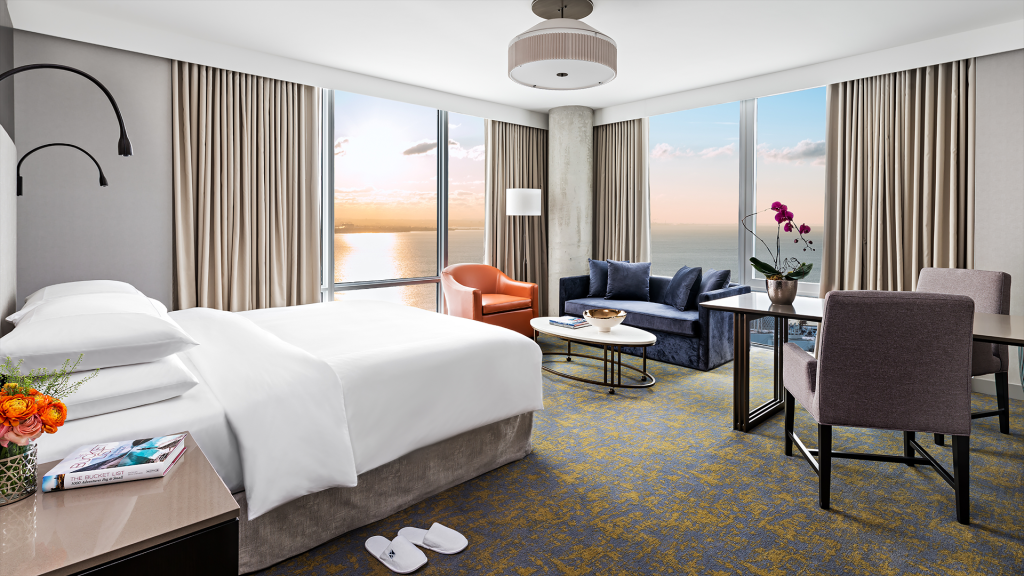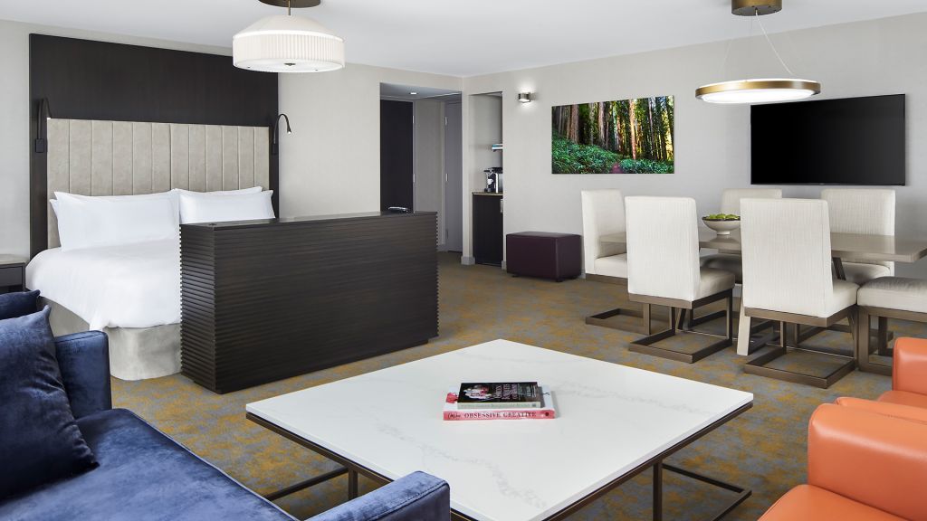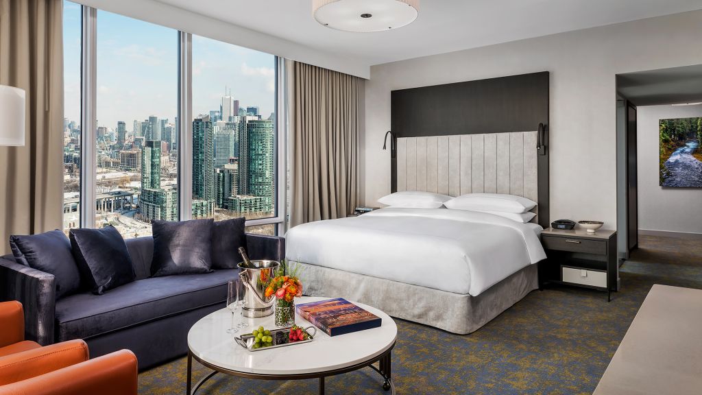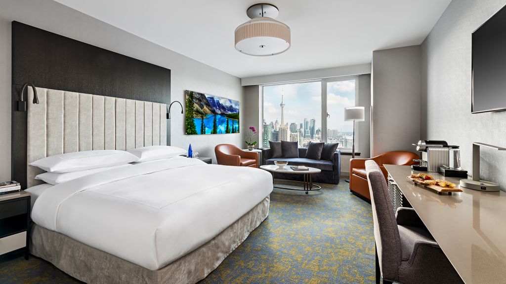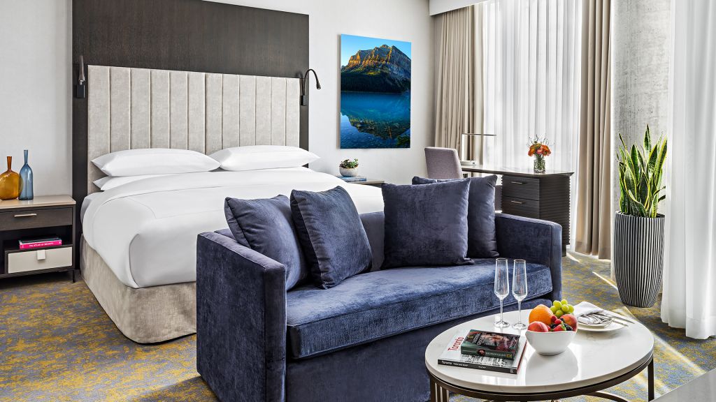 This 440-square-foot corner studio room delivers maximum comfort, along with spectacular views of Lake Ontario or the Toronto skyline. Its appeal continues with comfortable seating, a king bed and a sleeper sofa. A spacious bathroom features a high-pressure, glass-enclosed stand-alone shower.