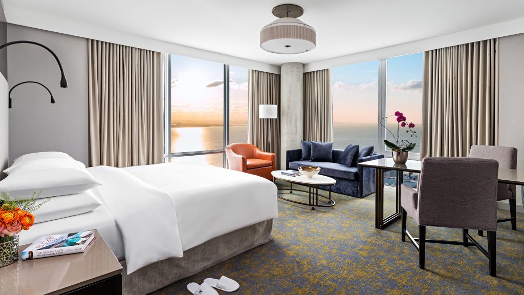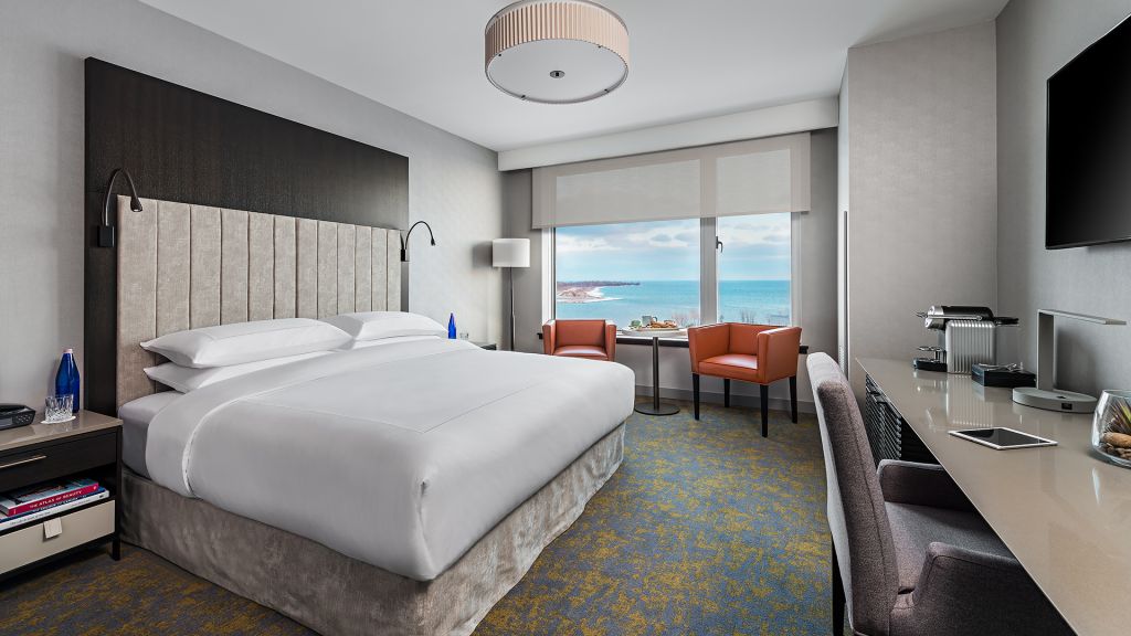 Take in superlative views of Lake Ontario from this well-appointed 270-square-foot room with a king bed, comfortable seating, a dedicated workspace and a sleek bathroom that includes a high-pressure stand-alone shower.