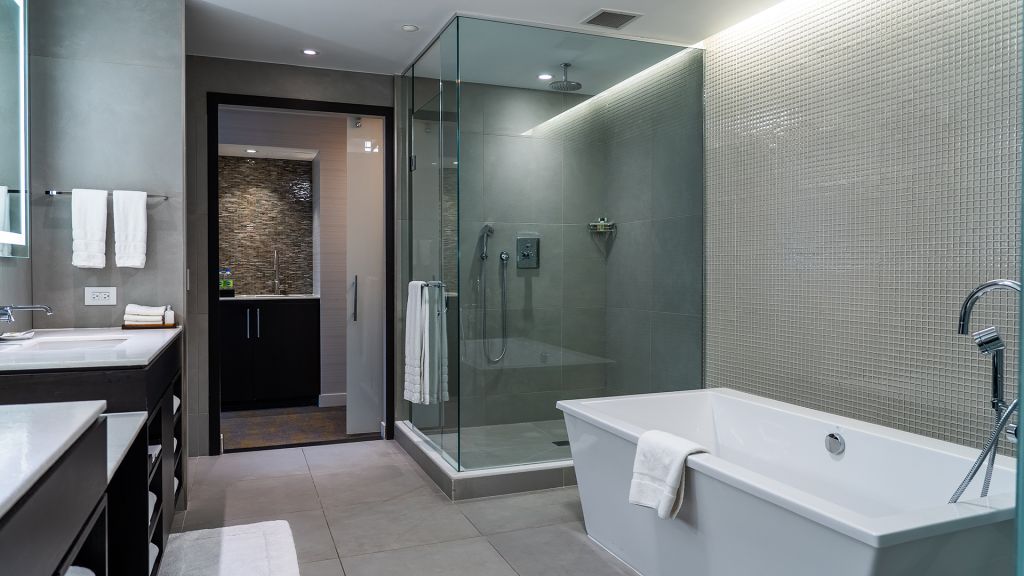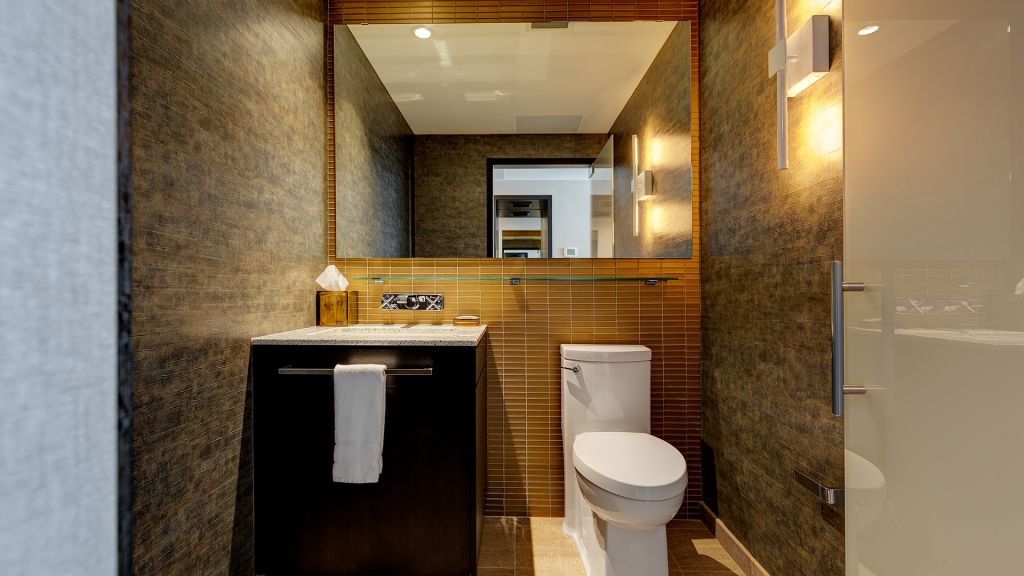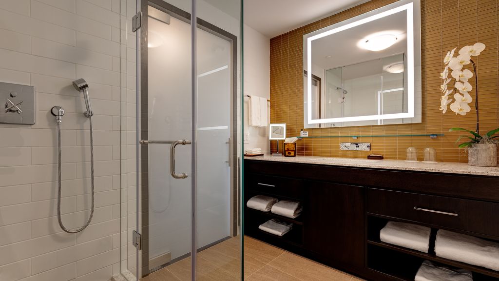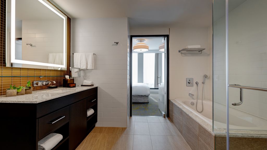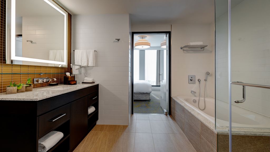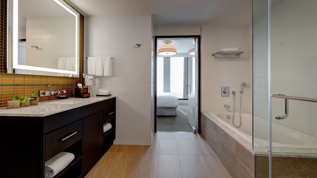 Enjoy a gorgeous lake or city view from this beautifully appointed 760-square-foot suite with king bed and floor-to-ceiling windows that open for fresh air. A comfortable living area has a sleeper sofa, dedicated workspace and a powder room. The main bathroom includes a soaking tub and a separate glass shower.
