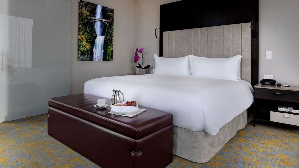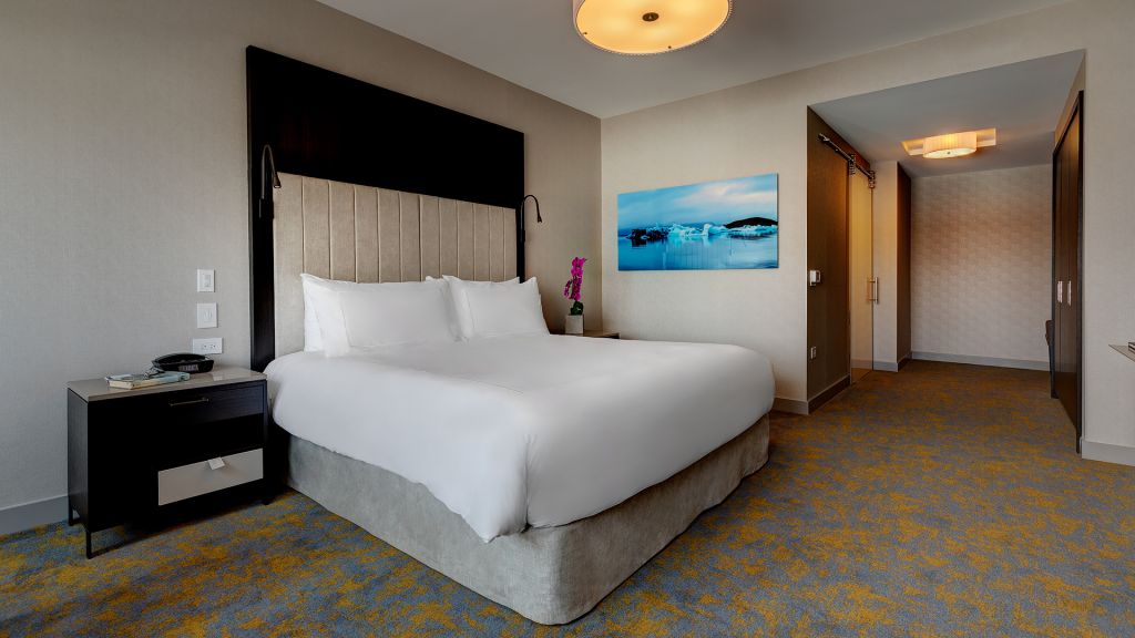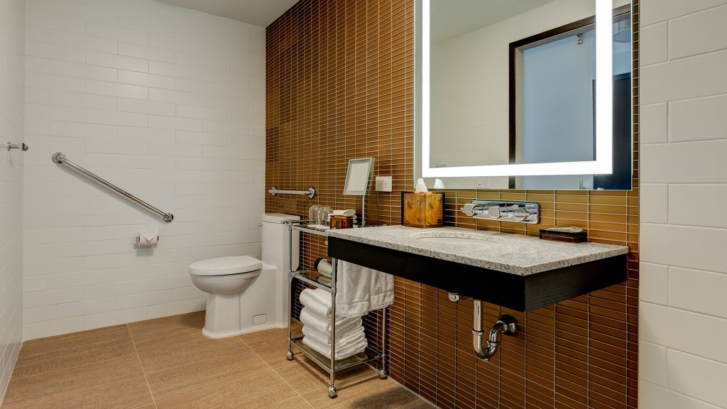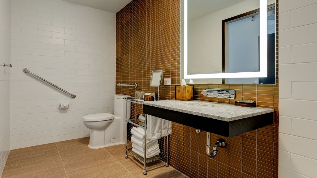Settle into this elegantly designed 380-square-foot accessible room offering wonderful city or partial lake views. Amenities include a king bed, a well-appointed workspace, wide doorways and an accessible bathroom with a roll-in shower.