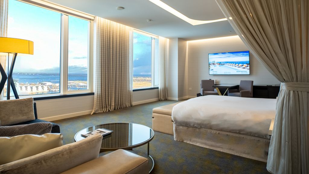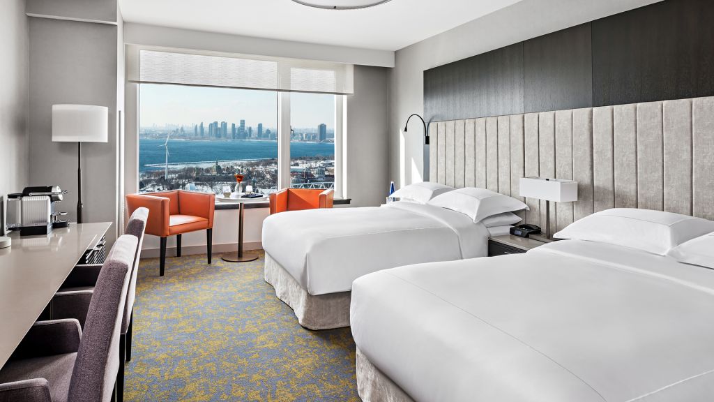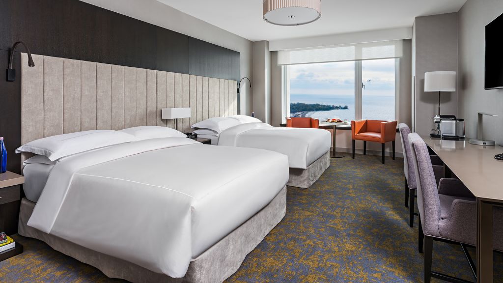 Stretch out and settle back in this 440-square-foot room with a breathtaking view of Lake Ontario. Two queen beds with pillow-top mattresses and cozy seating prioritize comfort. The spacious bathroom includes a glass-enclosed shower and a separate stand-alone bathtub.