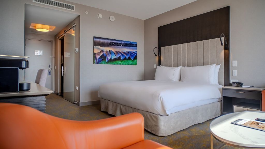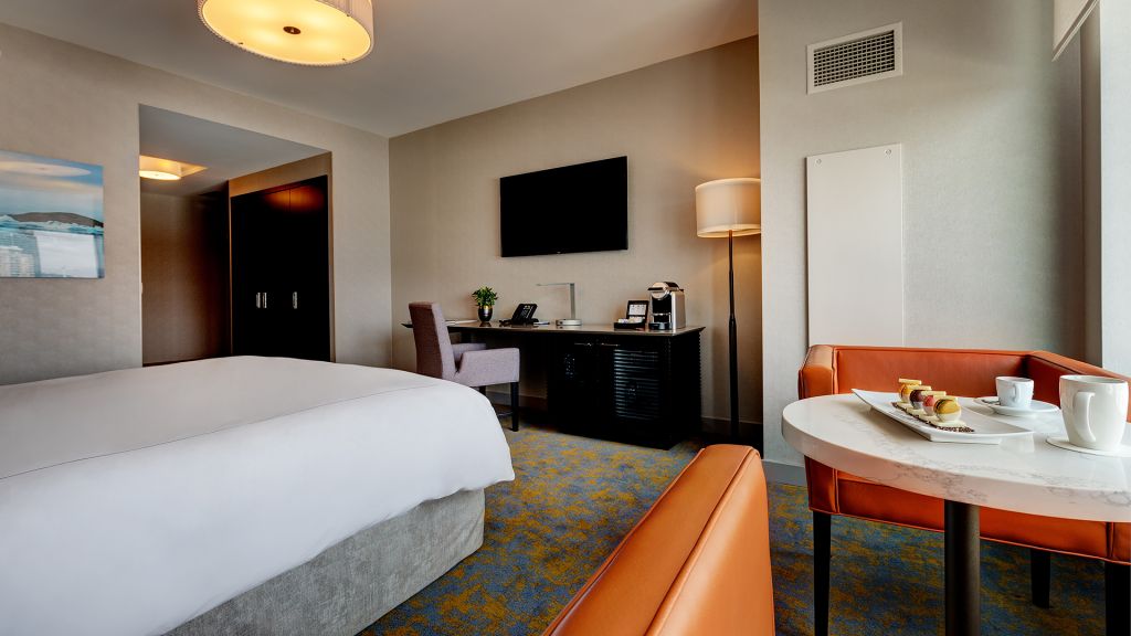 Kick back and unwind in this stylish 270-square-foot room, with a king bed, comfortable seating and welcoming workspace. You’ll also enjoy a partial view of Lake Ontario. The sleek bathroom includes a high-pressure standalone shower.