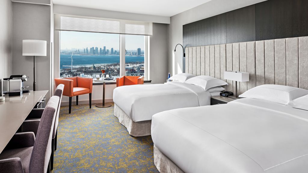 Treat yourself to wonderful views of Toronto’s skyline or Lake Ontario from this 380-square-foot accessible room. Its charms continue with two comfortable queen beds, wide doorways and an accessible bathroom with a roll-in shower.