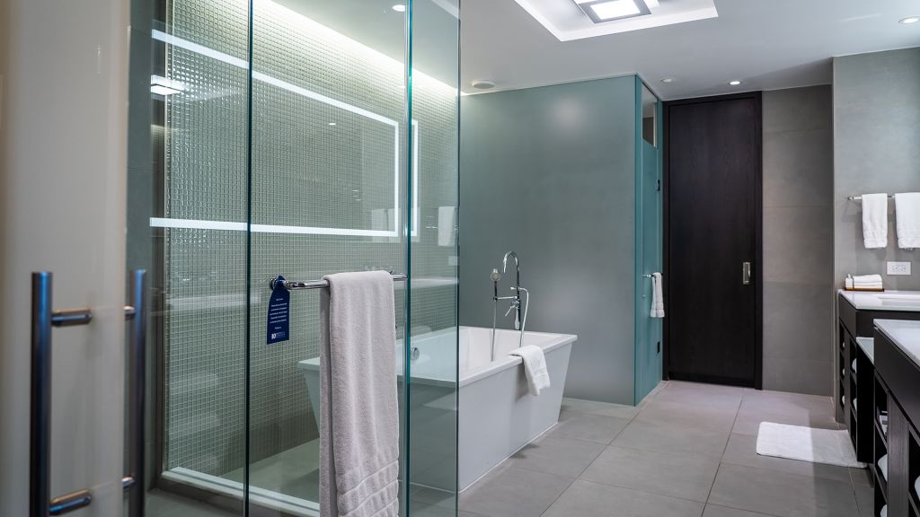 Relax in style in this 760-square-foot corner suite. Views of downtown Toronto or Lake Ontario grace the spacious living area, which includes a sleeper sofa, comfortable seating, powder room and inviting workspace. A king bed boasts a luxe pillow-top mattress. The grace notes continue with the main bathroom’s stand-alone bathtub and glass shower.