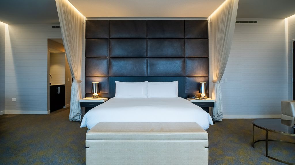 Expand your horizons in this 760-square-foot suite with amazing views of the Toronto skyline. The appeal continues with a king canopy bed, a seating area with sectional couch/sleeper sofa and impressive 85-inch flat-screen TV. An oversize bathroom offers two sinks with a shower and a bathtub. This suite can connect with the Penthouse to create a two-bedroom ultra-luxurious suite.