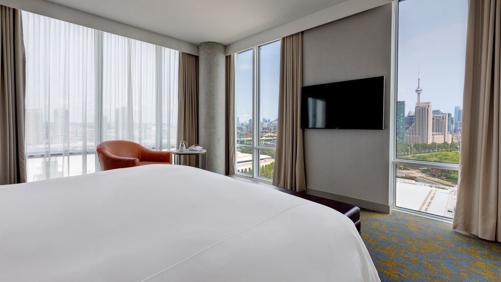 Elegance and a welcoming vibe distinguish this 380-square-foot room with oversize windows showcasing a superb view of Toronto’s skyline. Amenities put a premium on comfort, including a king bed with a pillow-top mattress. The bathroom features a high-pressure, glass-enclosed stand-alone shower.