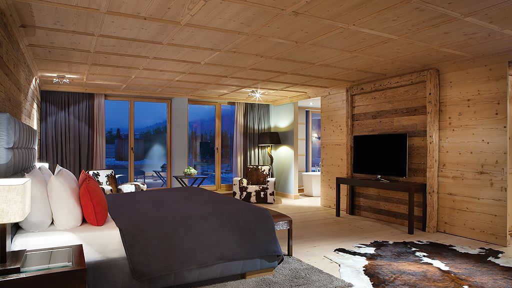 Alpen suite - one king bed, village view. The room features 1 flat screen tv, home cinema system, wlan, tea and coffee maker, safe. Spacious wardrobe. Separate luxurious living room with dining and living area, separate kitchenette. Desk with direct dial telephone and a cordless telephone for in-house use. The bathroom includes either a bathtub or shower, two sinks as well as separate toilet with underfloor heating. Spacious balcony with sitting facilities. Maximum capacity: 3 persons. 105 sqm large.