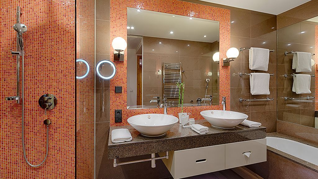 Deluxe junior suite - two twin beds or one king bed, mountain view. The rooms feature 2 flat screen tvs, wlan, tea and coffee maker, minibar, safe and air condition. Walk-in coset. Desk with direct dial telephone and a cordless telephone for in-house use , dining and living area with sofa bed. The bathroom includes a bathtub and a separate shower cabin, two sinks as well as separate toilet with underfloor heating. Spacious balcony with sitting facilities. Maximum capacity: 2 adults and 2 children or 4 adults. 55 sqm large.