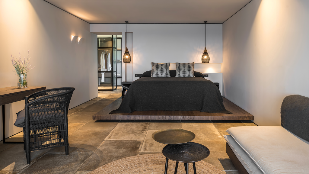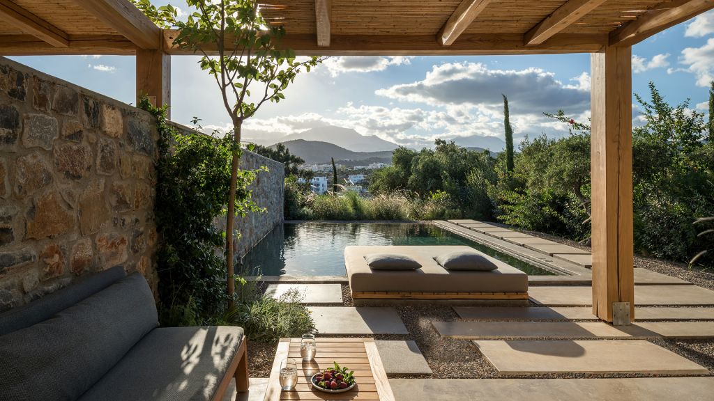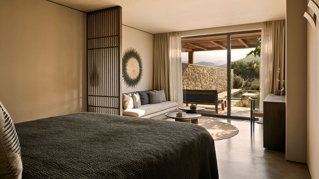 60sqm, king bed, AC, safe, minibar, phone, TV, shower, WC, bathrobe, slippers, furnished terrace, private pool
