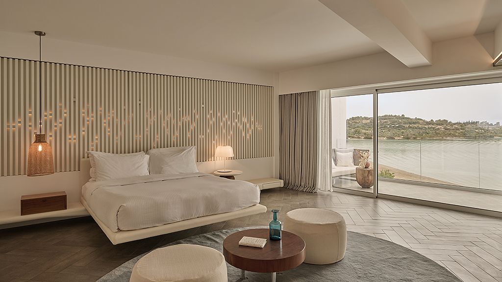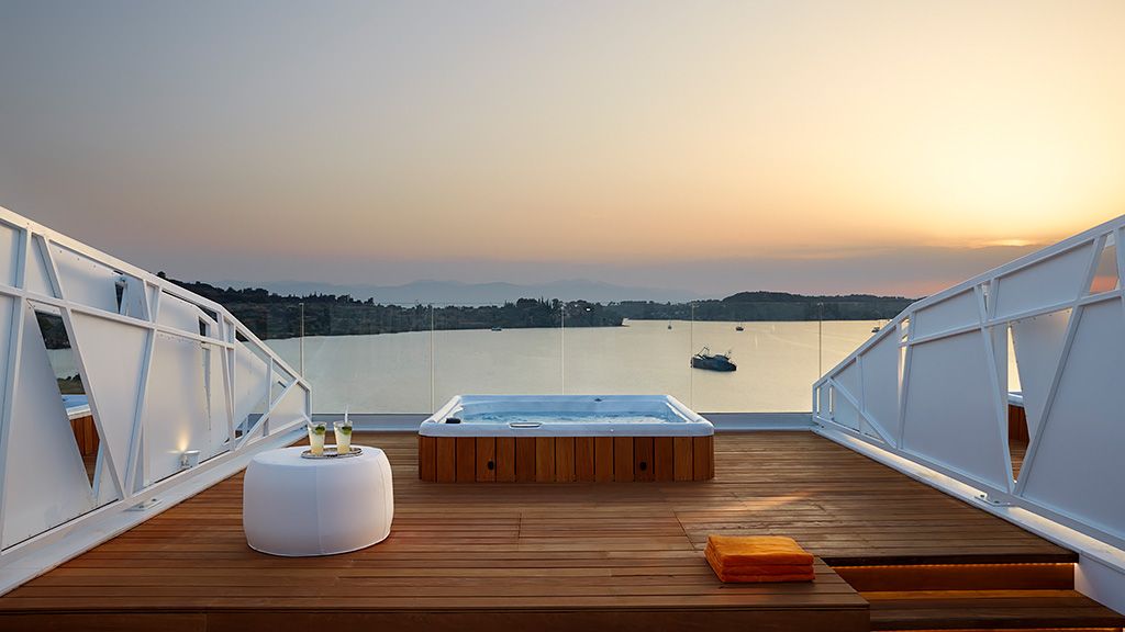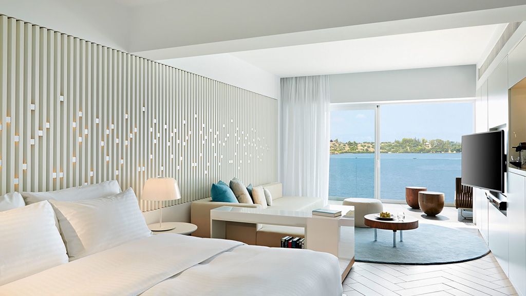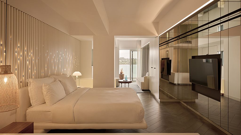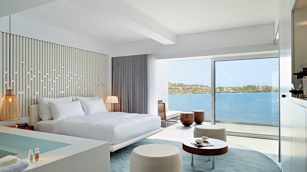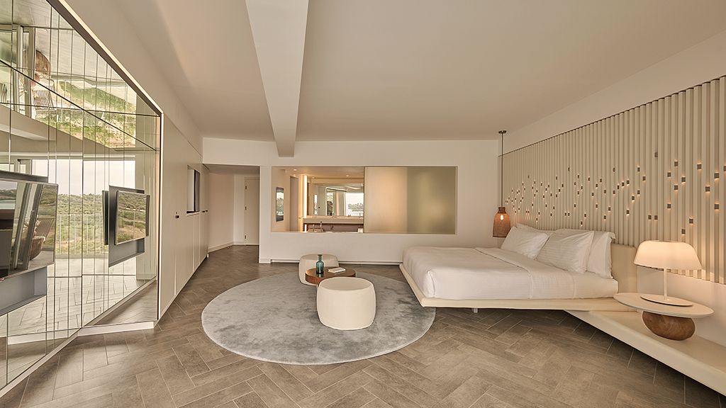 The signature suite offers a complete feeling of indulgence and comfort, furnished with king -size beds. The sleek white and contemporary furniture with blue and wooden details, compose an elegant and tasteful combination. The room offers a private balcony with transparent glass panels to enjoy impressive views of the porto heli bay.
