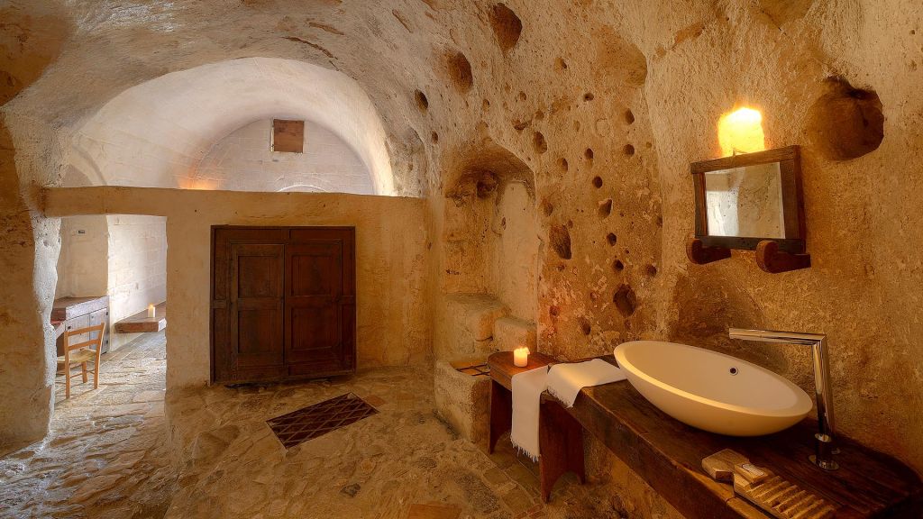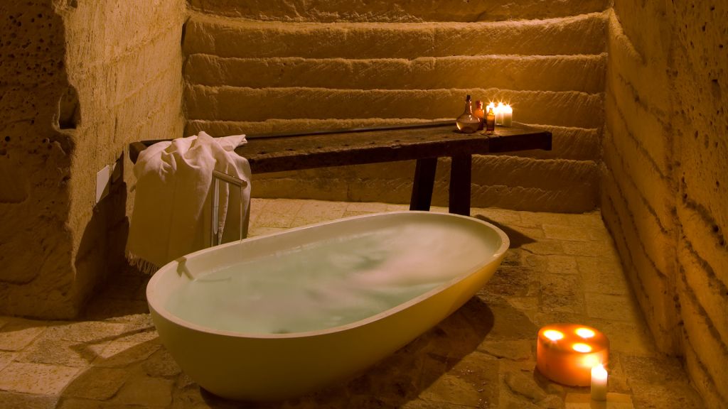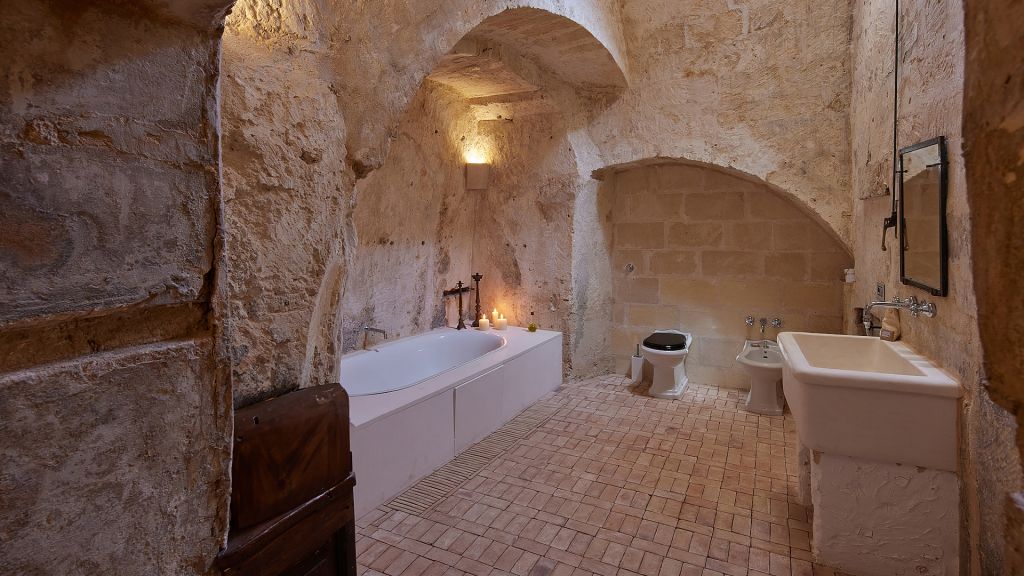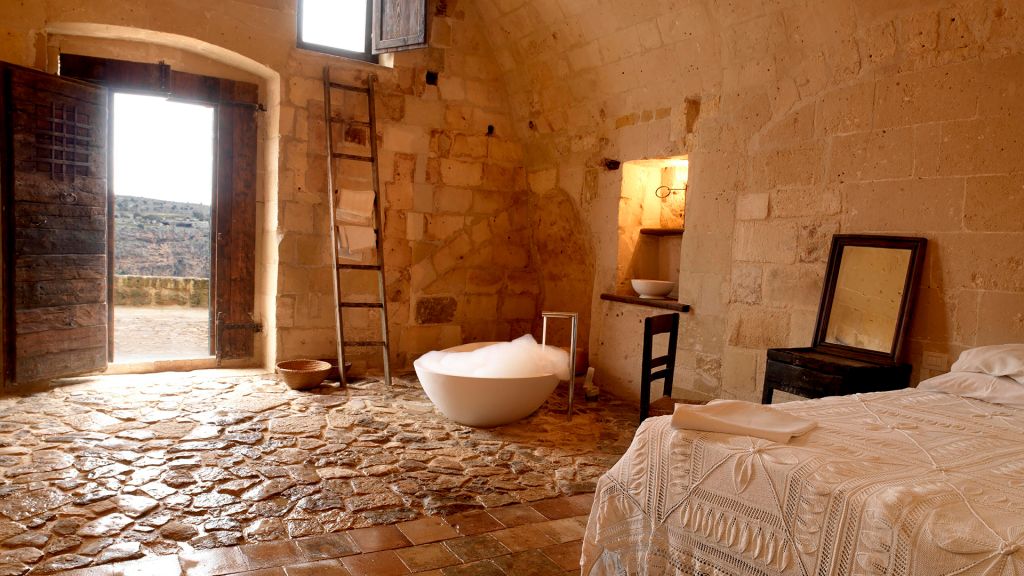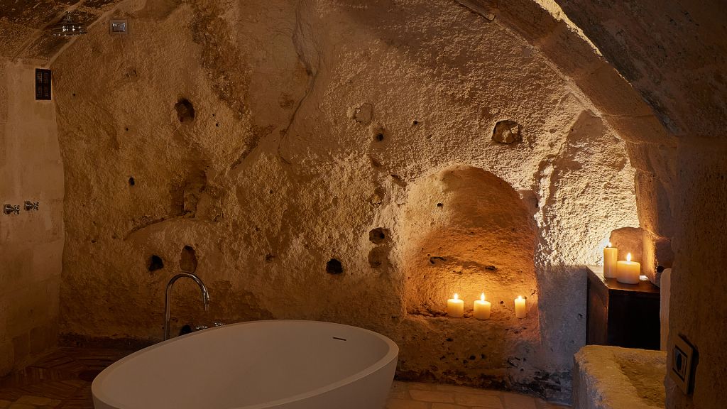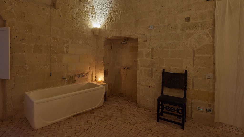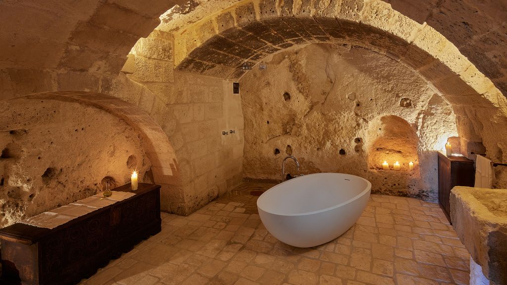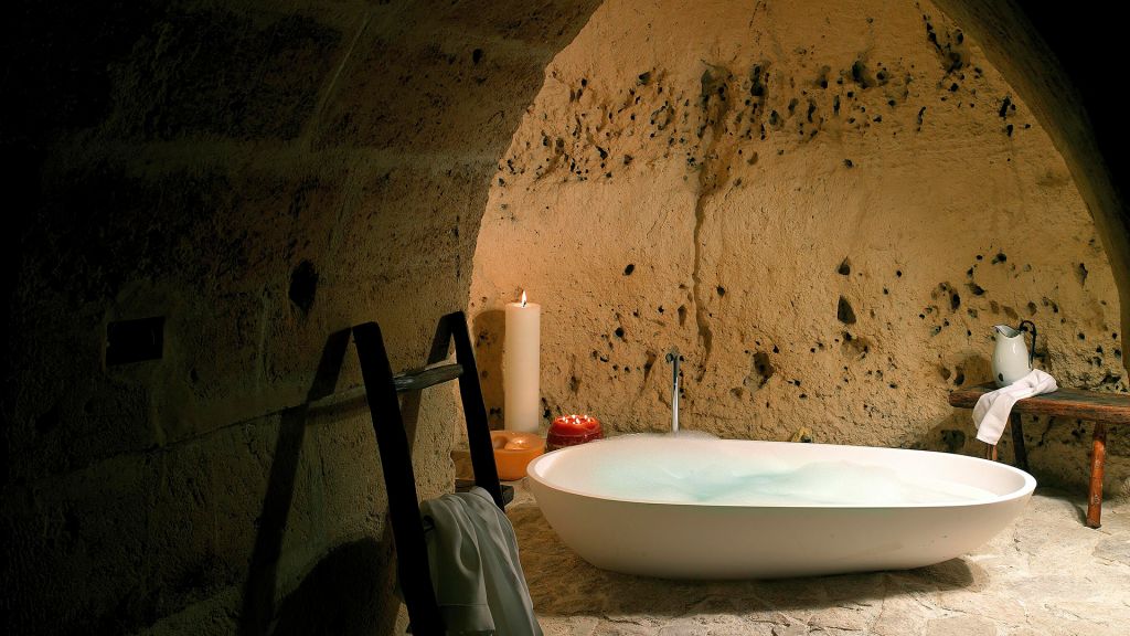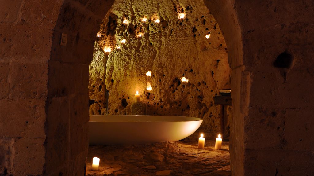 Trekking throughout Sassi provides almost endless curiosities, but guests here may opt to spend a day of recluse in the cave: reading a book, sharing a heartwarming meal in the main atrium, or slowly enjoying a glass of wine in the bath.