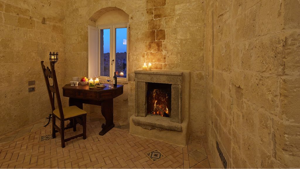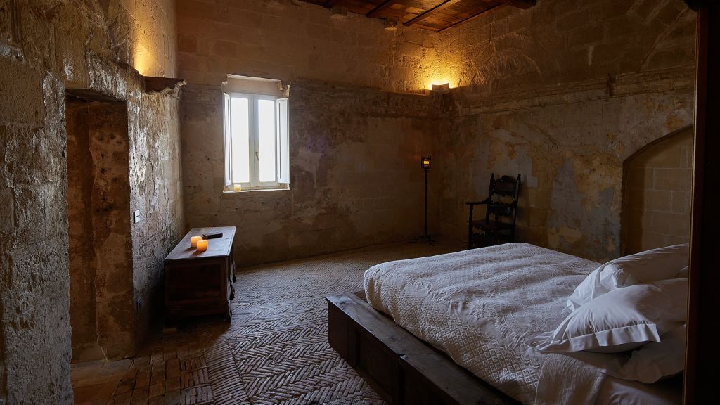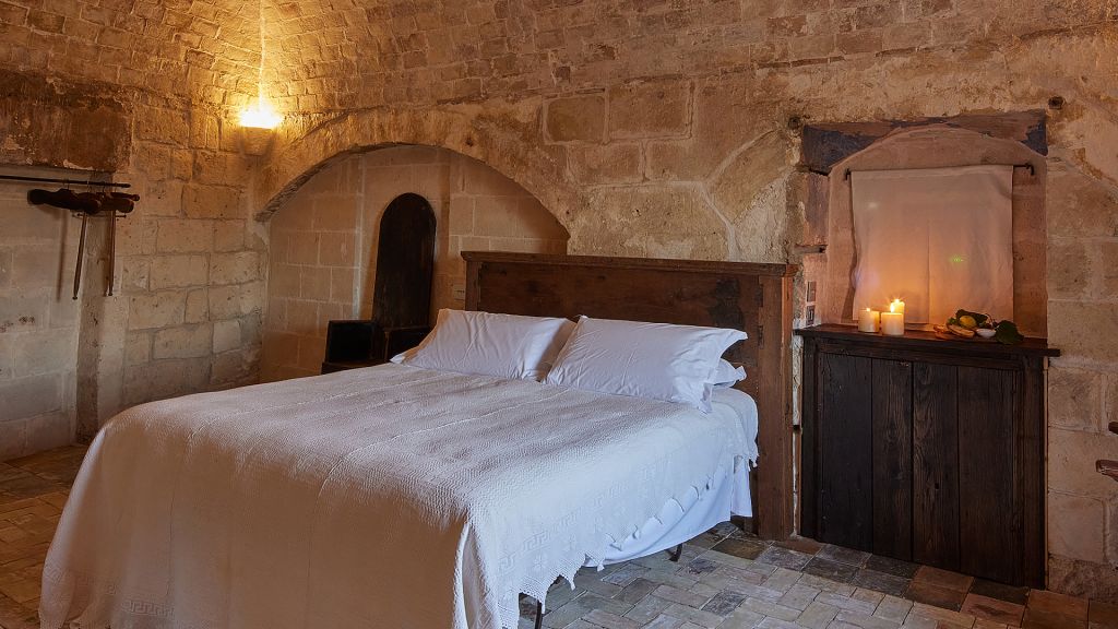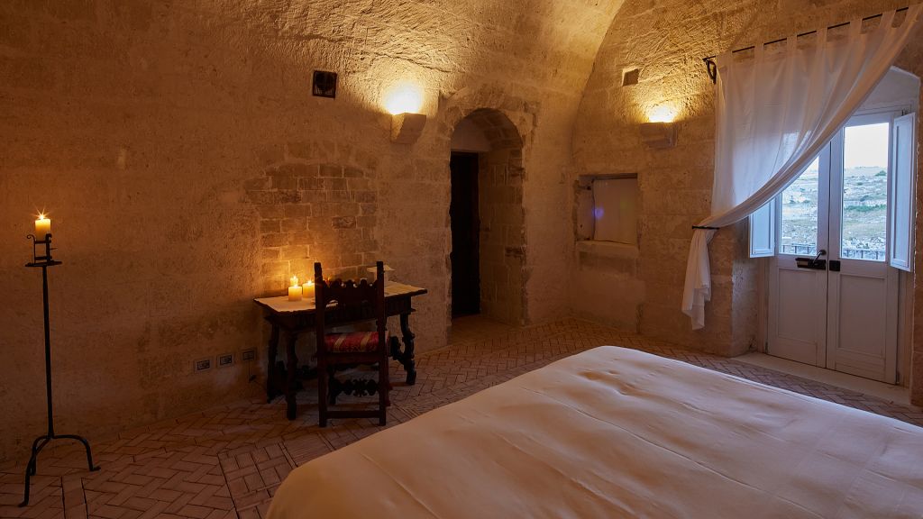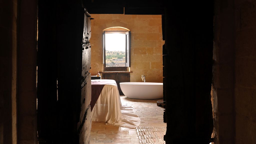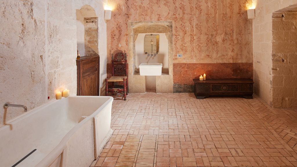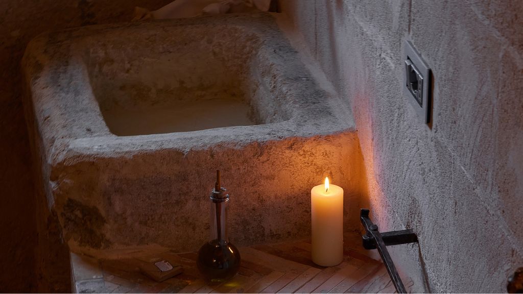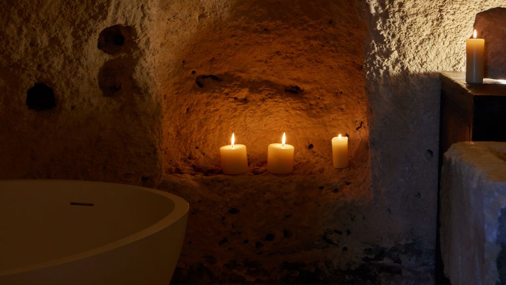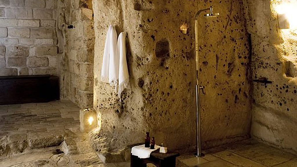 Trekking throughout Sassi provides almost endless curiosities, but guests here may opt to spend a day of recluse in the cave: reading a book, sharing a heartwarming meal in the main atrium, or slowly enjoying a glass of wine in the bath.