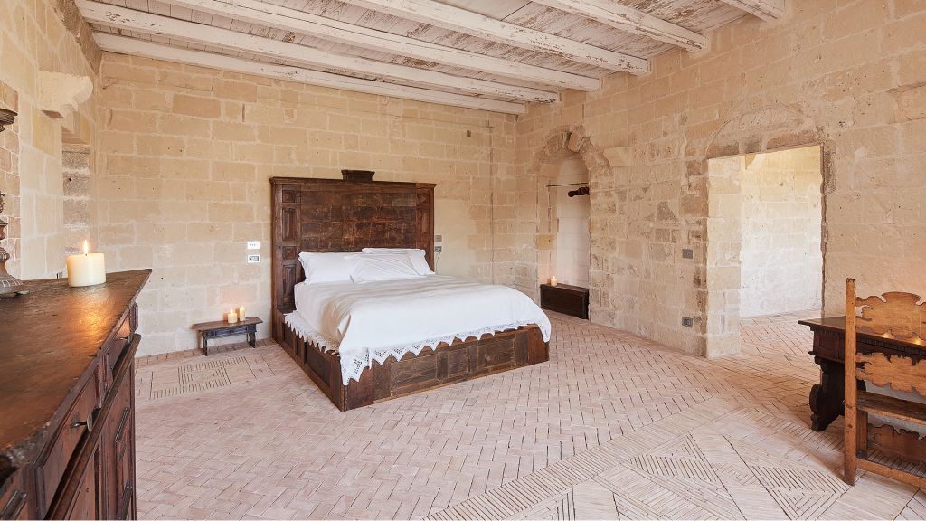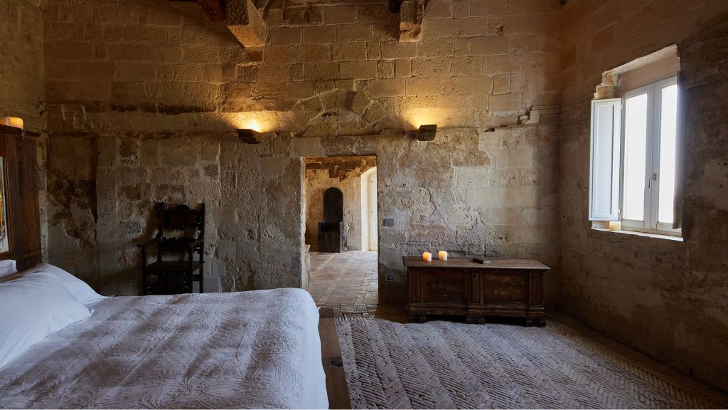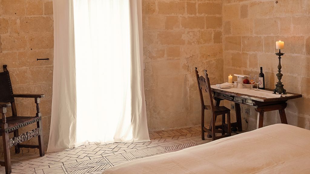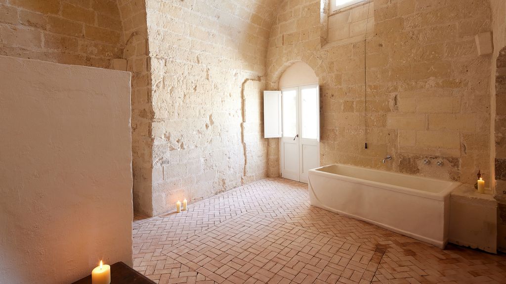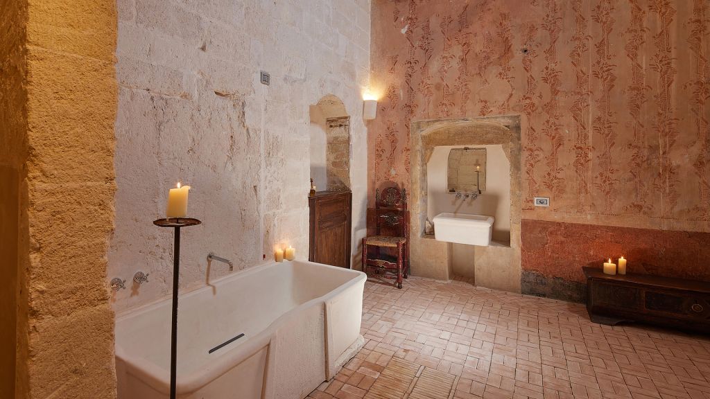 At Sextantio Le Grotte Della Civita, great care was put into restoring the hotel. Local materials were used to create linens, handmade furniture, room fragrances, and even candles. Modern amenities, like freestanding Stark baths, were chosen based on their unobtrusive design.