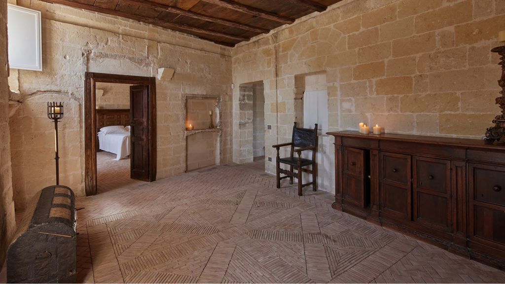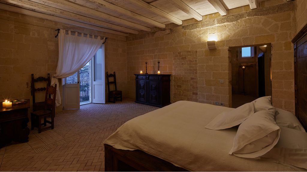 The ultra-spacious executive suite is set in a majestic xvii century palazzo with a stunning view over the valley and the sassi di matera. The recently restored suite sleeps 4 and features a sitting room with a fireplace, a balcony, and a bathroom with a tub and shower. Extra beds and baby cot are free of charge and available on request.