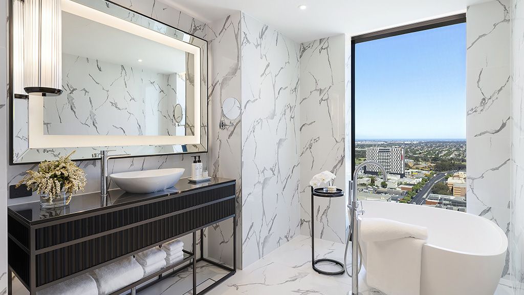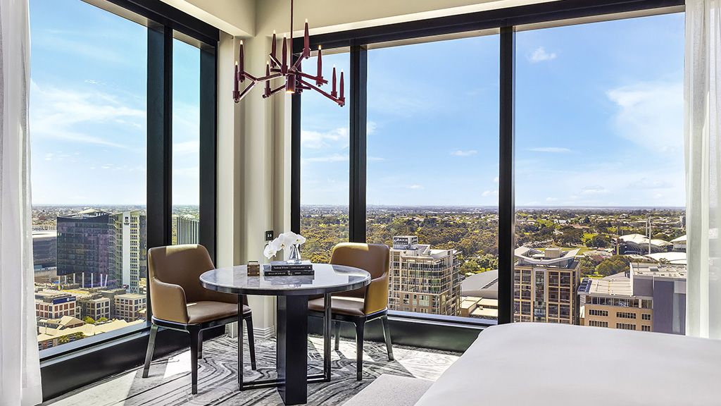 At Sofitel Adelaide, the city’s skyline unfolds beneath floor-to-ceiling windows—sunlight spilling across velvet sofas, the coast glimmering in the distance, and the hum of Adelaide below softened by layers of French elegance.