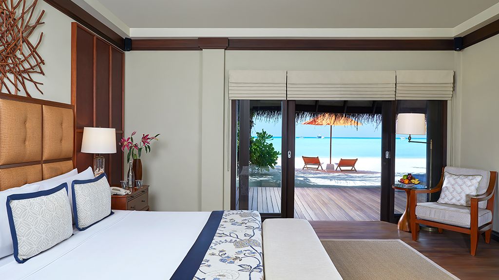 This opulent one bedroom beach villa suite is just five meters from the ocean. Set on the beach, it has a spacious living room, a private courtyard an oversized plunge pool.