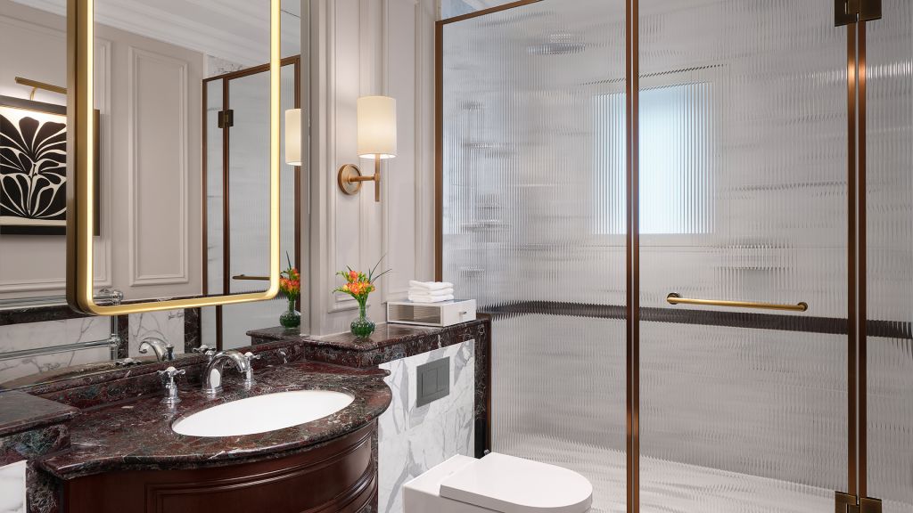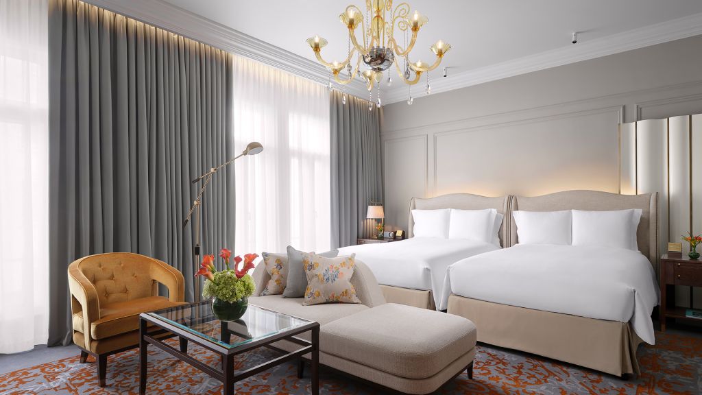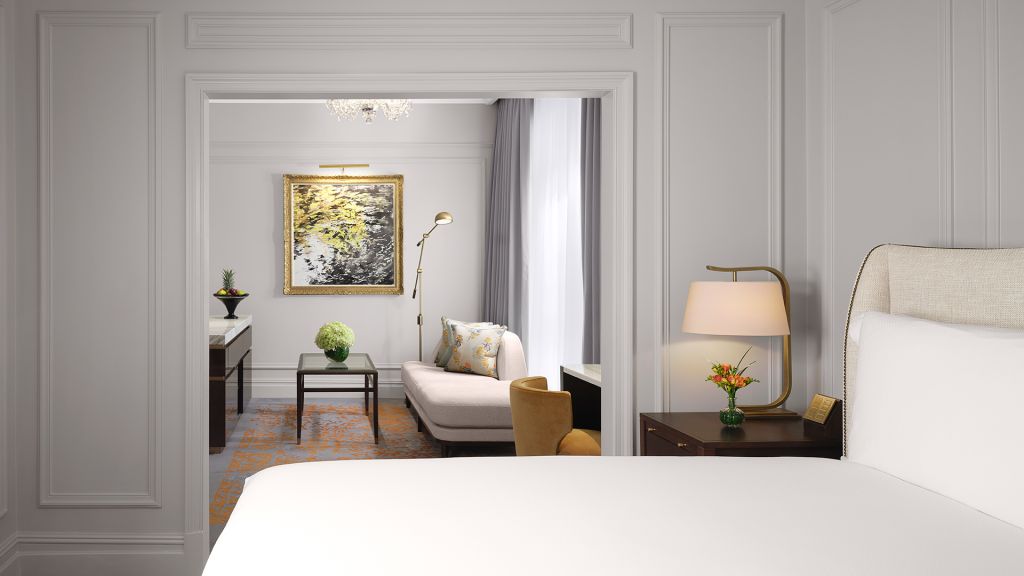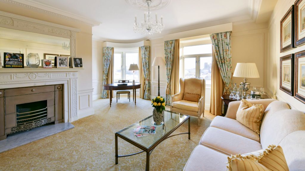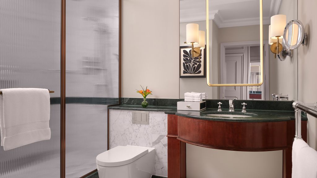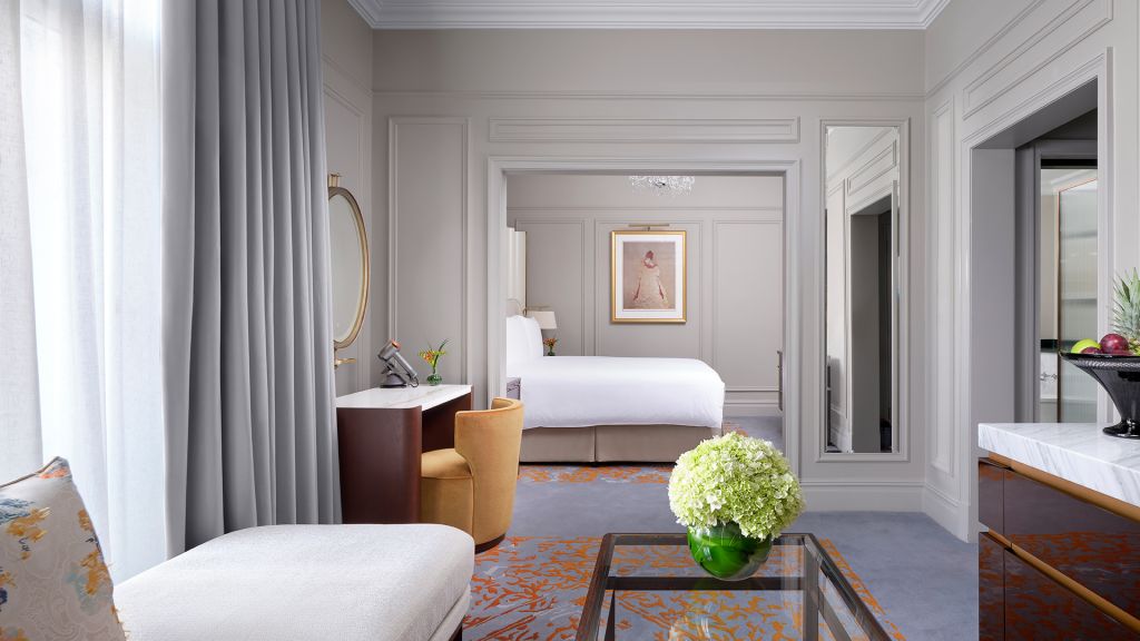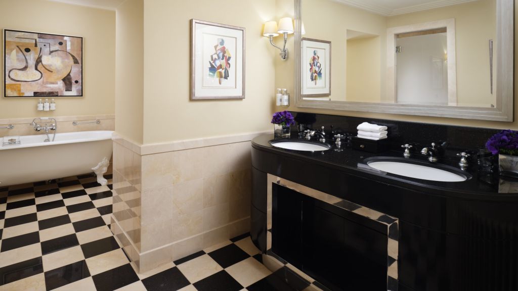 Features 1 King bed, panoramic river view, dressing table, armchair, sofa, writing desk, separate sitting room, entrance foyer, ensuite marble bathroom with freestanding claw-foot tubs and separate walk-in showers. Includes a TV, tea and coffee facilities, hair dryer, safe, bottled water, 24-hour gym access and Wi-Fi Internet. Possible to connect to a Junior Suite.
