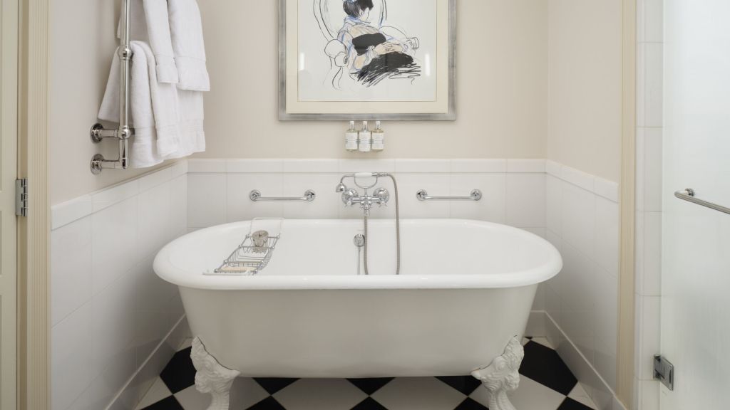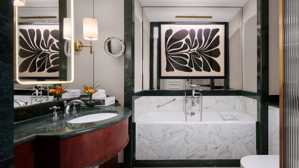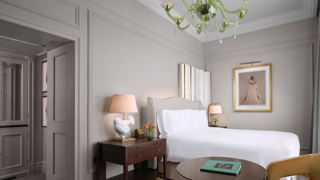 Features 1 King bed, city view, Edwardian or Art Deco style, two armchairs, writing desk, personal bar and a marble bathroom with rain showerhead.